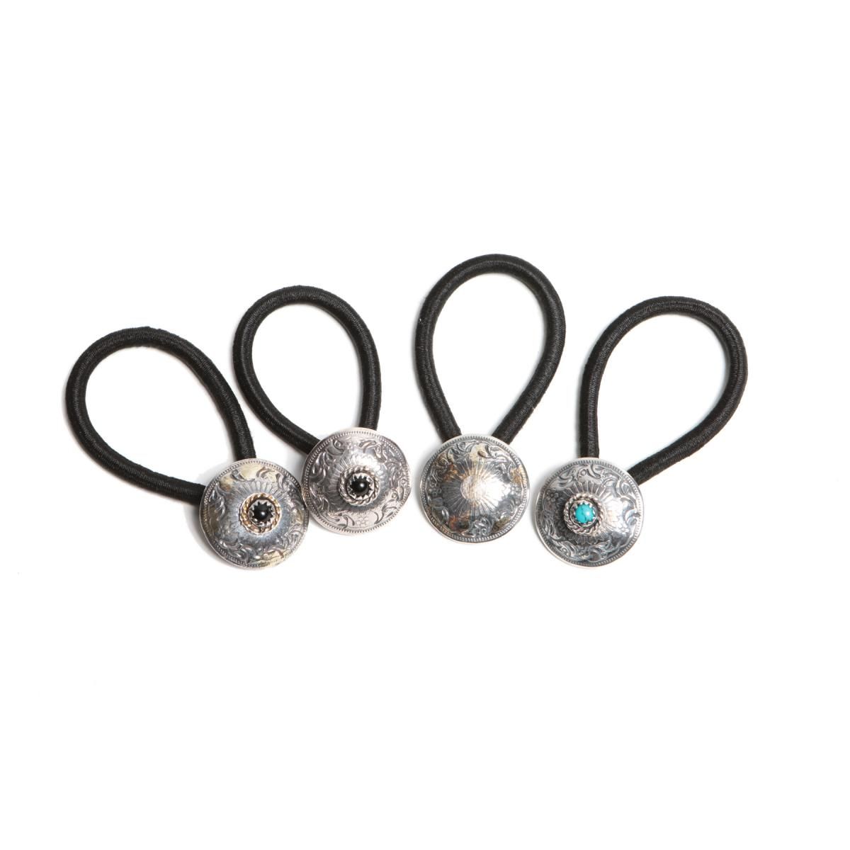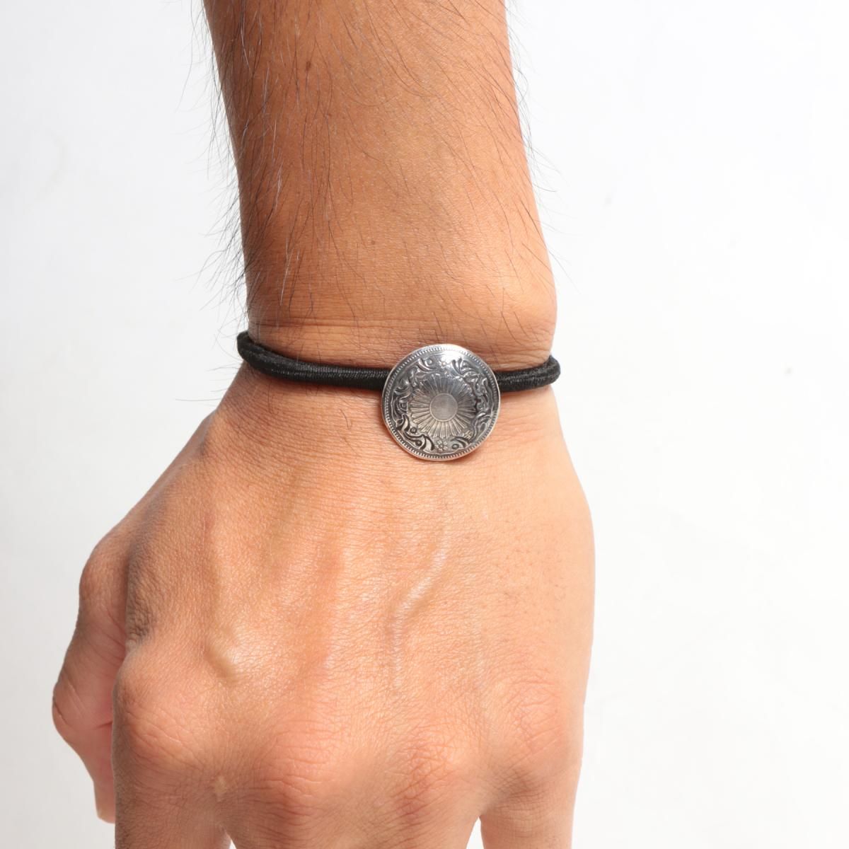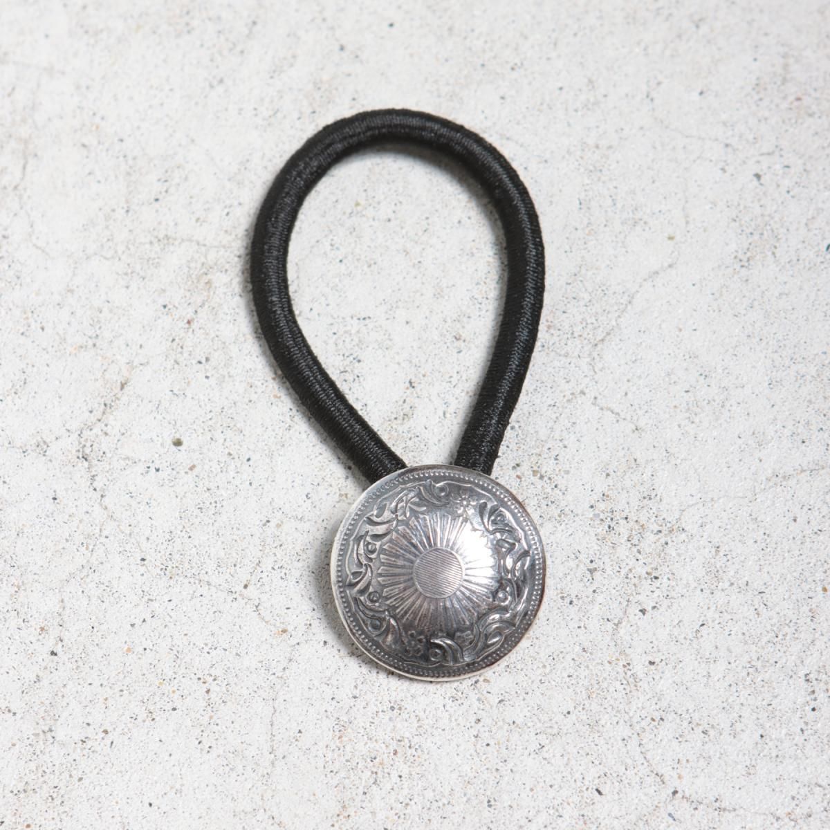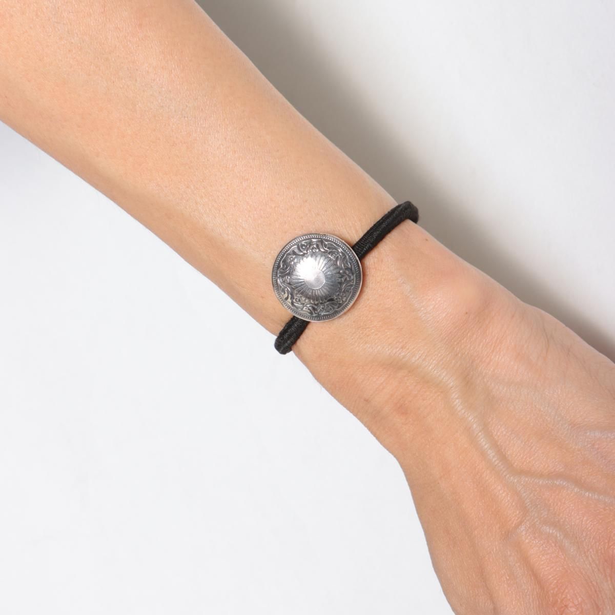 鳳凰,旭日をあしらった「小型鳳凰五十銭」の古銭を型取りし、Ag925(スターリングシルバー)で鋳造した特別なコインから制作したコンチョ(髪留め)です。髪をまとめるヘアアクセサリーとしてはもちろん、付属のゴム紐を手首に巻けばブレスレットとしても着用できる2WAY仕様で、気分やスタイルに合わせたアレンジが楽しめます。