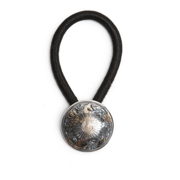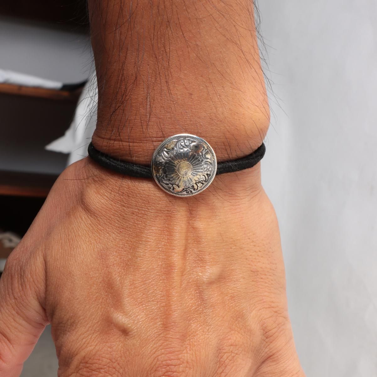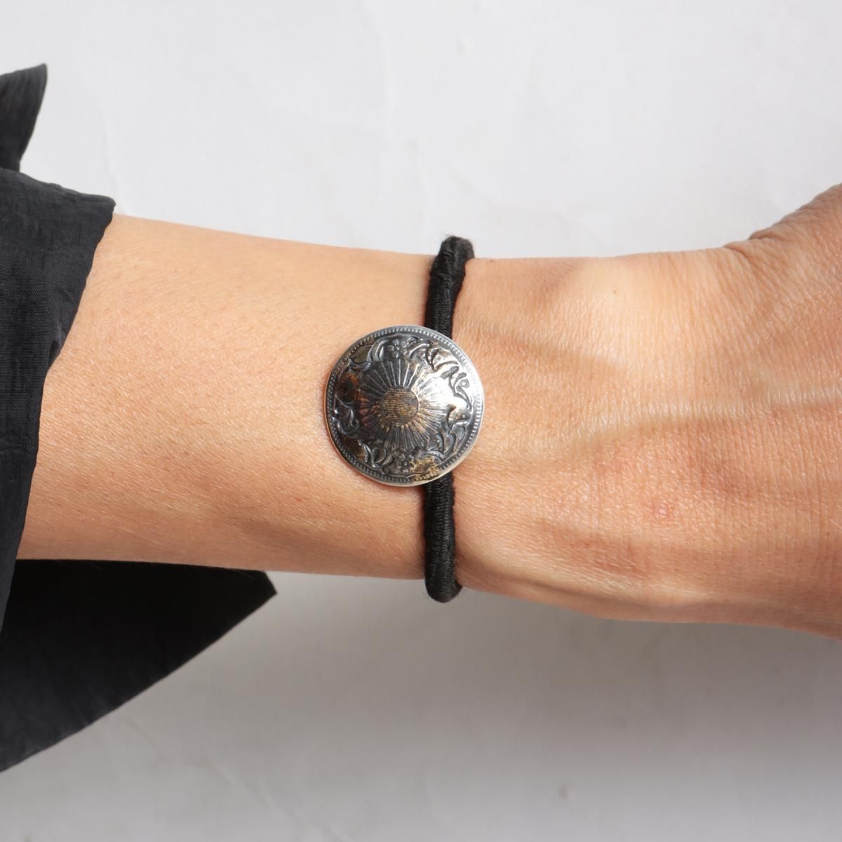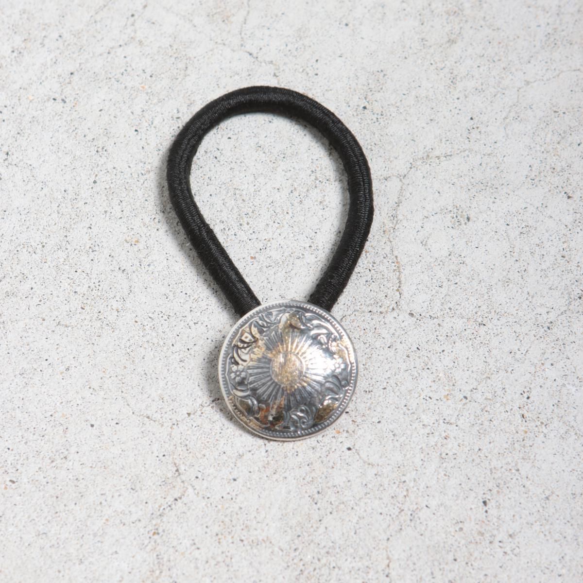 鳳凰,旭日をあしらった「小型鳳凰五十銭」の古銭を型取りし、Ag925(スターリングシルバー)で鋳造した特別なコインから制作したコンチョ(髪留め)です。髪をまとめるヘアアクセサリーとしてはもちろん、付属のゴム紐を手首に巻けばブレスレットとしても着用できる2WAY仕様で、気分やスタイルに合わせたアレンジが楽しめます。