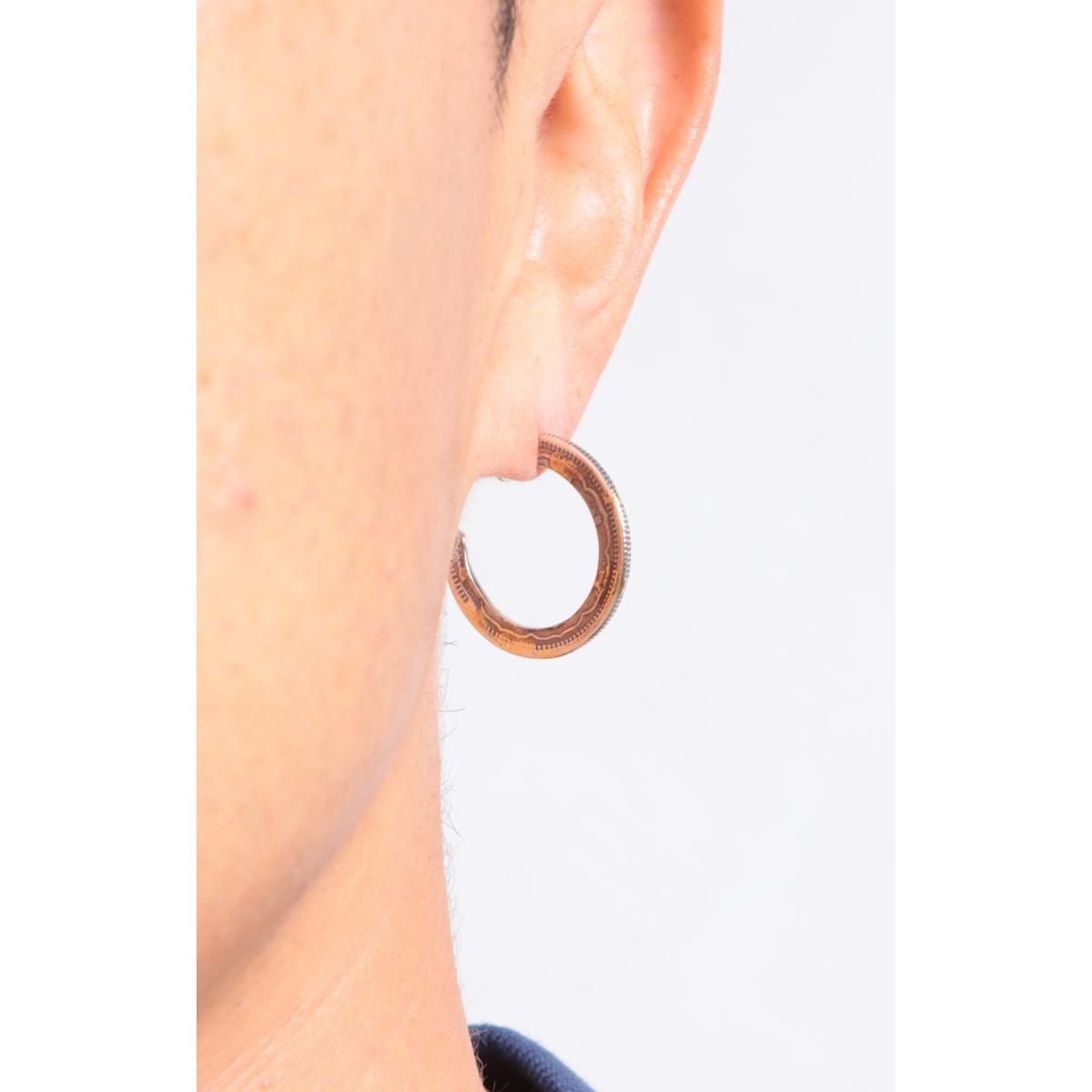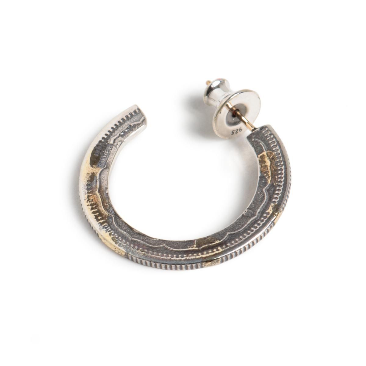 このピアスでは、古銭の象徴的な意匠(旭日・鳳凰)ではなく、側面に施された“ギザギザ”と、それを囲む縁飾りの模様にフォーカス。それらをあえて「線」として捉え、ミニマルで現代的なアクセントデザインに落とし込んでいます。