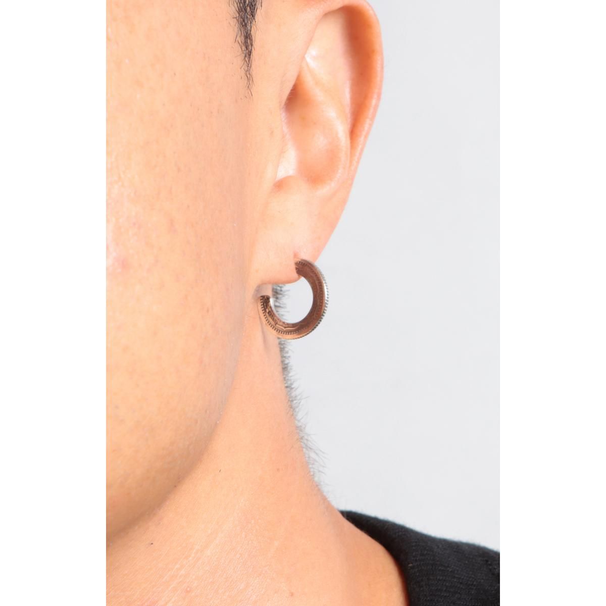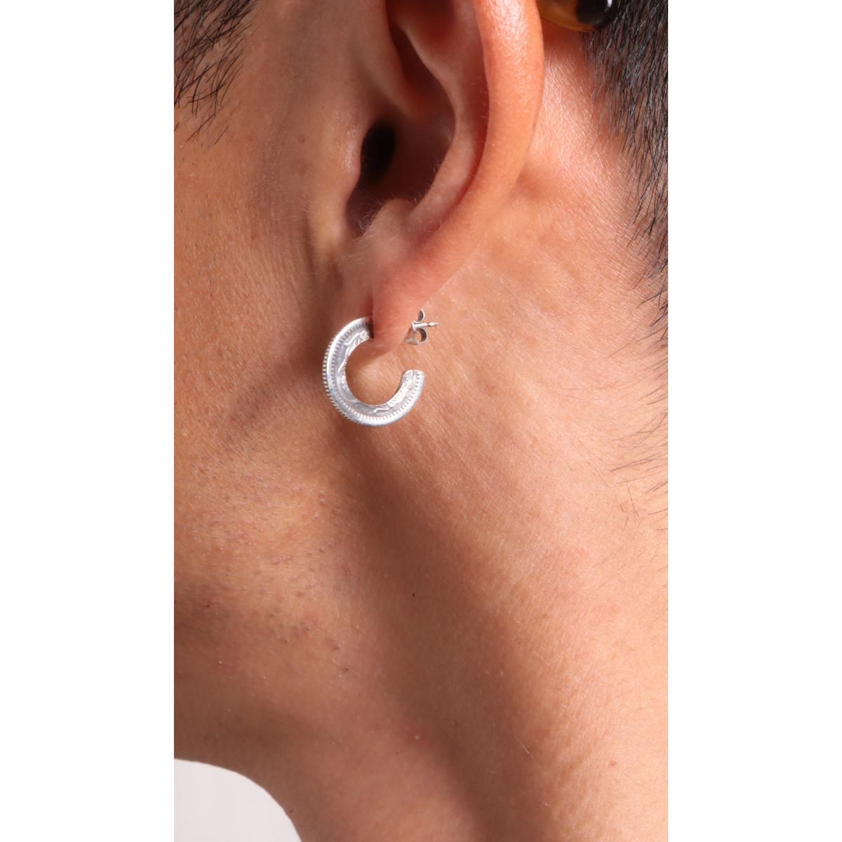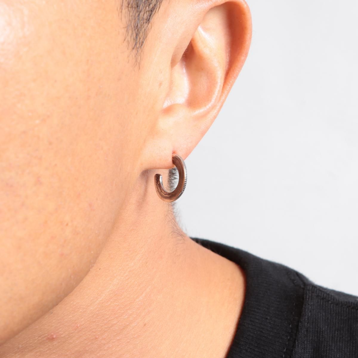 このピアスでは、古銭の象徴的な意匠(旭日・鳳凰)ではなく、側面に施された“ギザギザ”と、それを囲む縁飾りの模様にフォーカス。それらをあえて「線」として捉え、ミニマルで現代的なアクセントデザインに落とし込んでいます。
